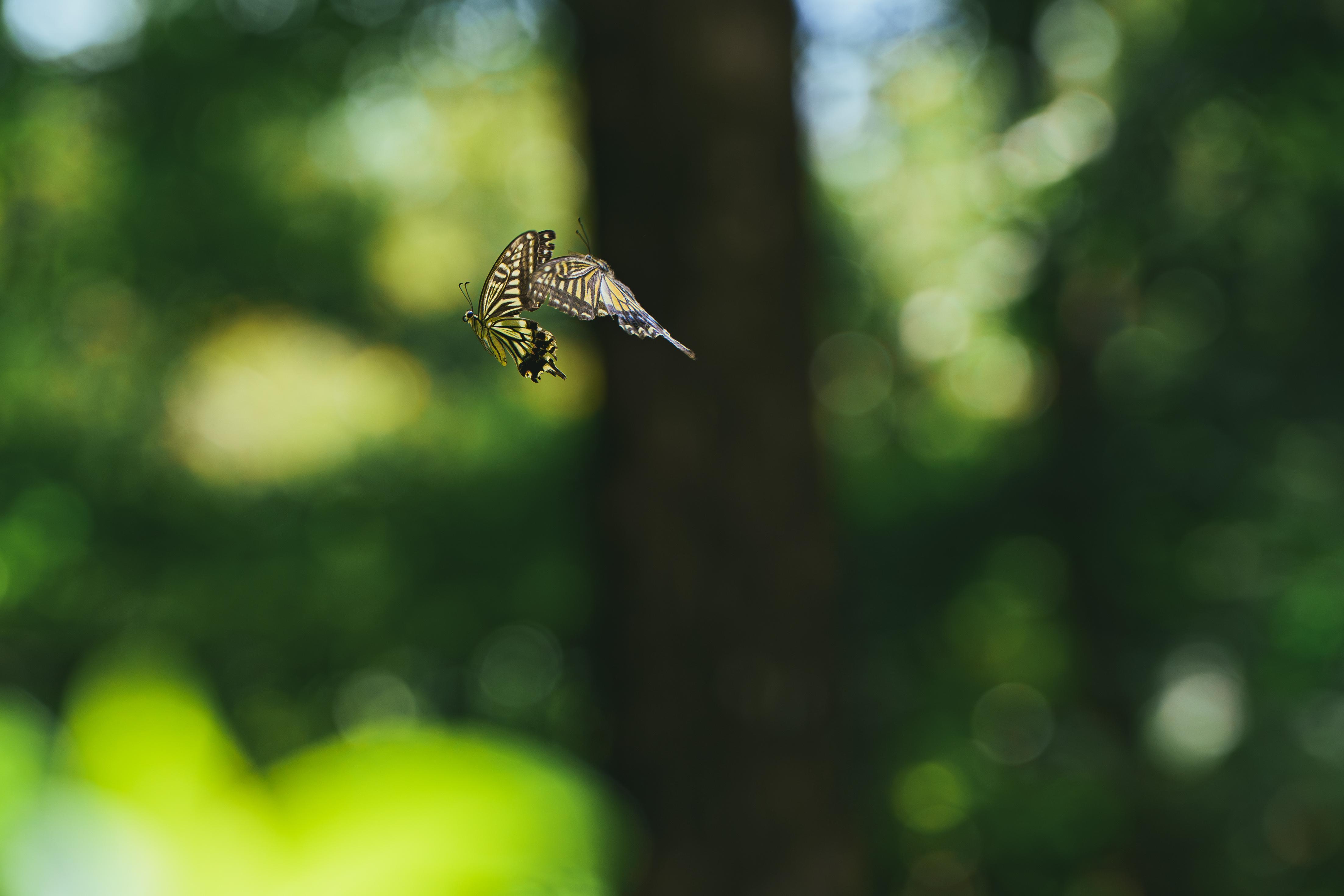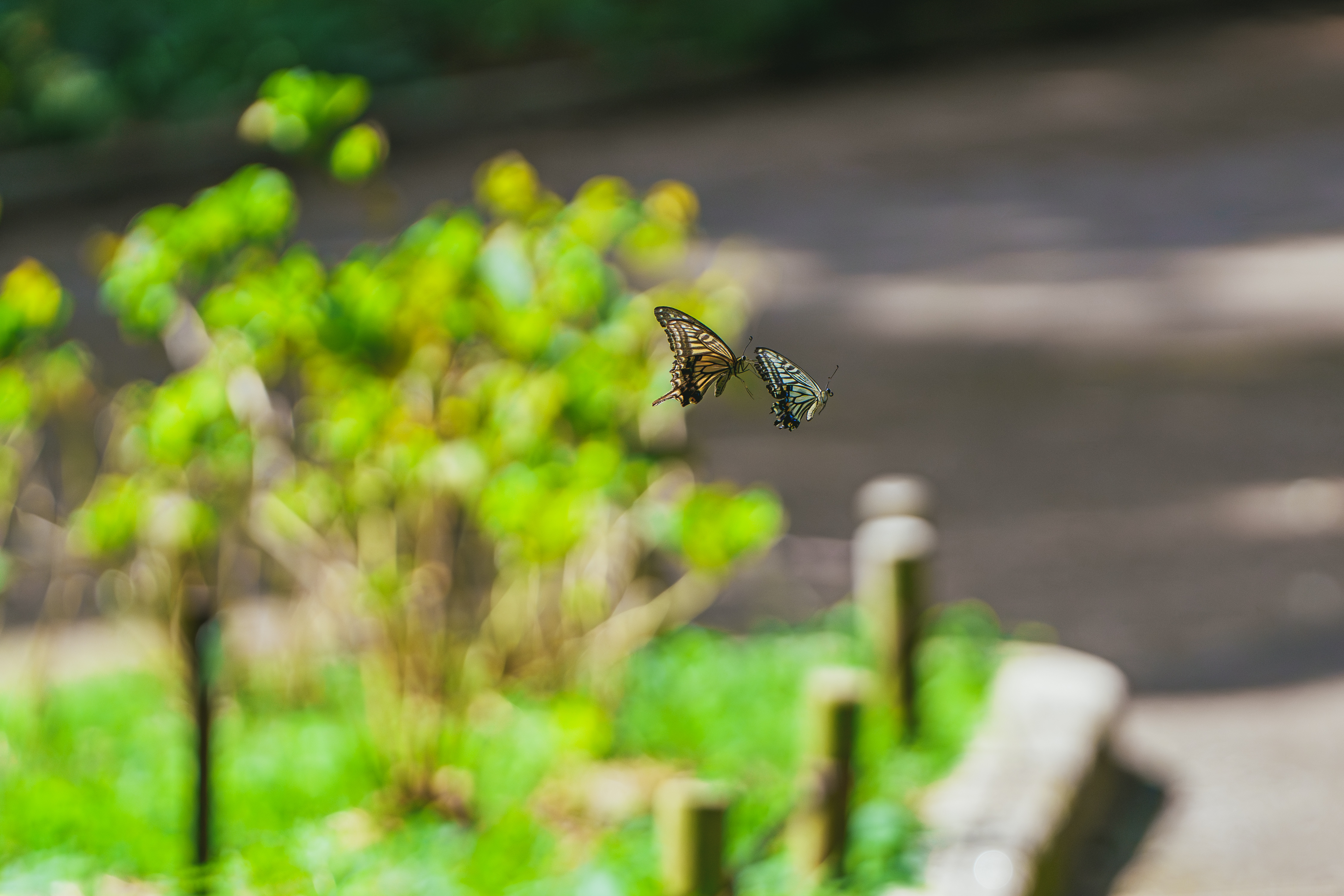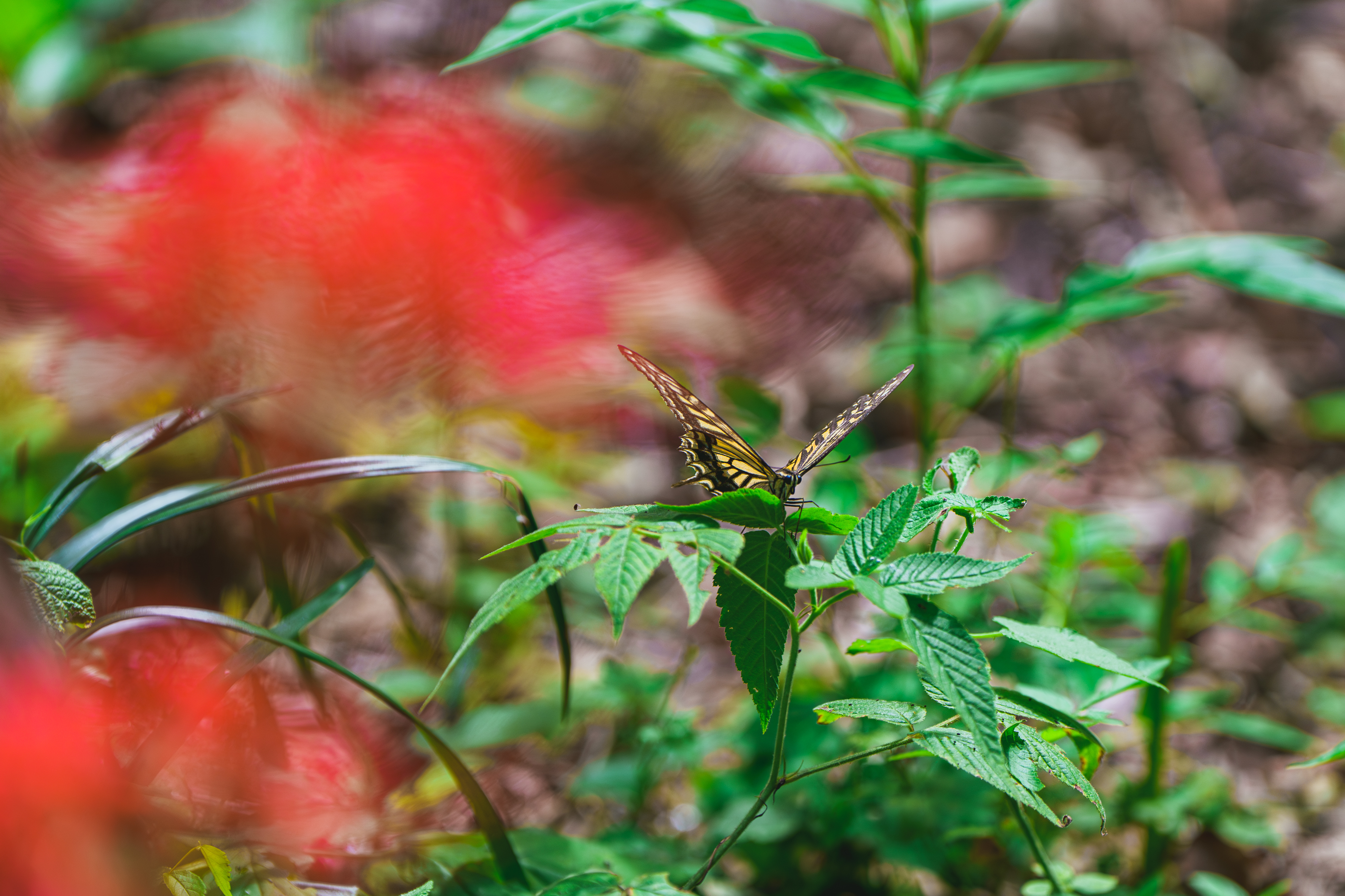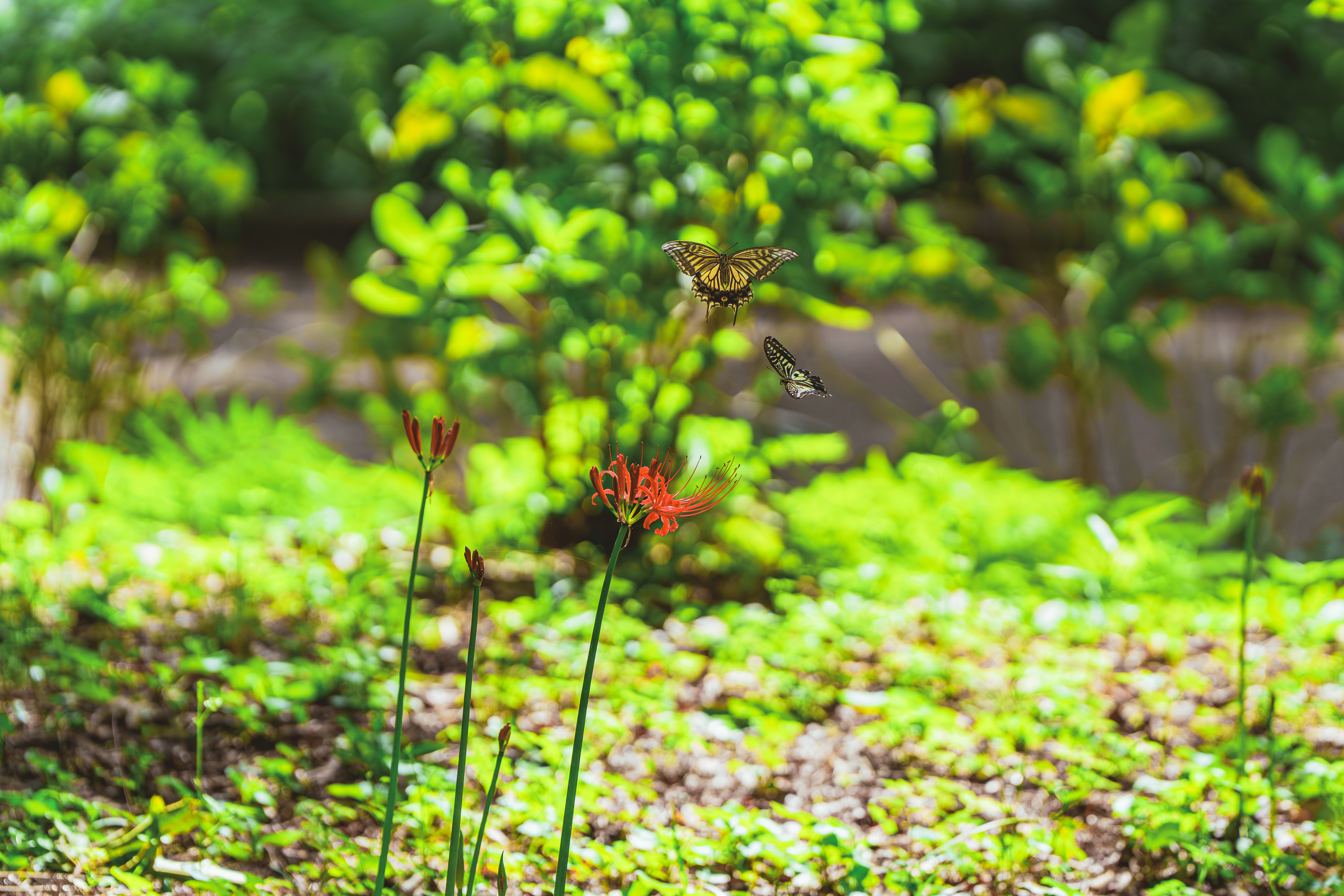 日向と日陰の彼岸花は変わらない形なのに、真逆の表情を見せる。それが気に召したか、蝶々が集り、舞う姿を披露してくれた。これがもし秋らしい気温だったら、おそらく見れなかった光景だったでしょう。