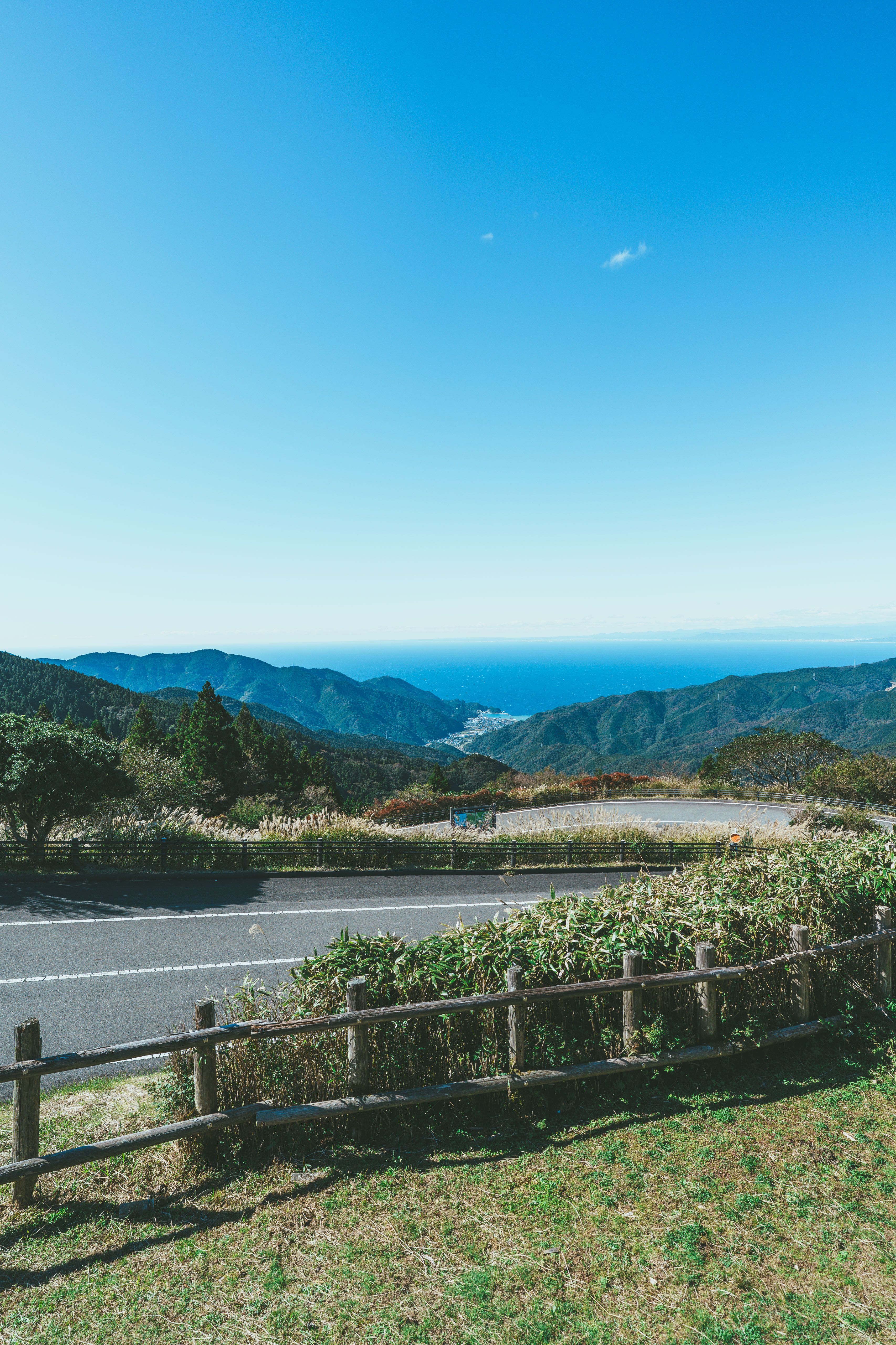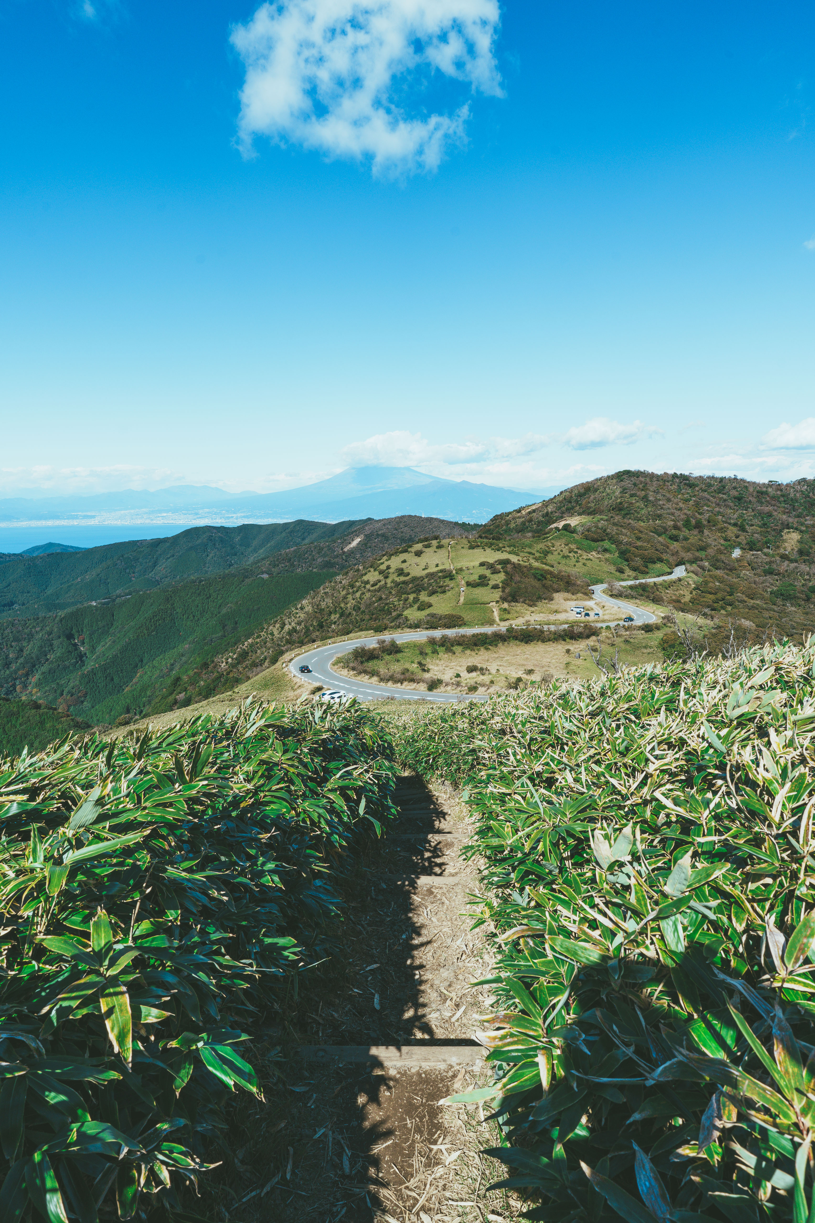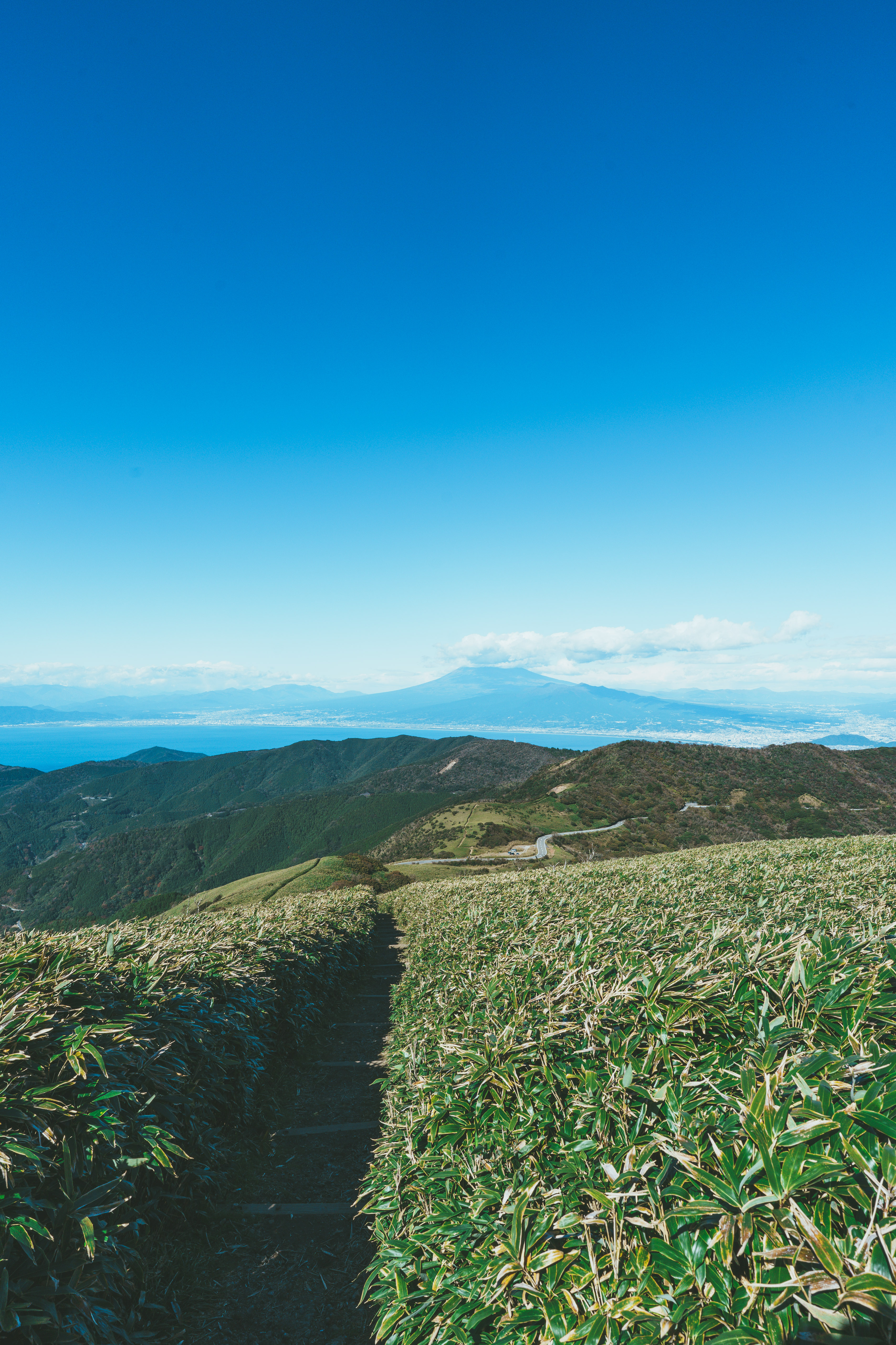 あくまでプチ登山というところですが、ここは初心者に優しい達磨山。洗ったような青空と、海風にそよぐ笹の葉が手招いてくれる。生憎富士山は山頂を雲に隠しているが、近くの戸田港は惜しげなく全容を見せてくれた。